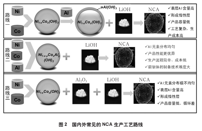 NCA材料的表面堿性較高,電極漿料粘度不穩定,容易出現粘度增加甚至產生果凍現象,導致電池極板制作過程中的涂覆性能較差;NCA材料對濕度敏感,容易吸潮,并且材料中的Li2O持續與CO2反應,導致材料性能劣化甚至失效,因此在電池生產過程中,電極漿料、極板、卷芯等對水分非常敏感,整個生產環境對濕度的要求比較苛刻,導致設備投入和生產成本較高。因此,國內電池生產廠家正在積極開發NCA電池體系,大多處于跟蹤研究和技術探索階段,距離工業化應用的要求還有一定的差距。